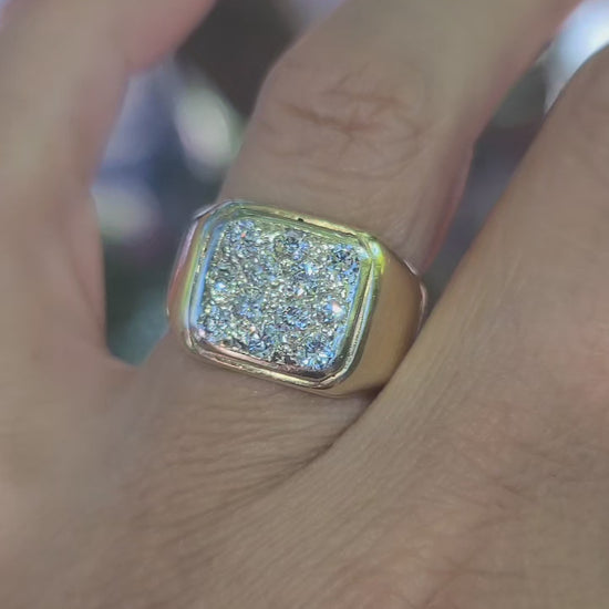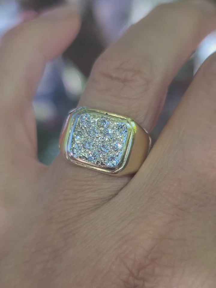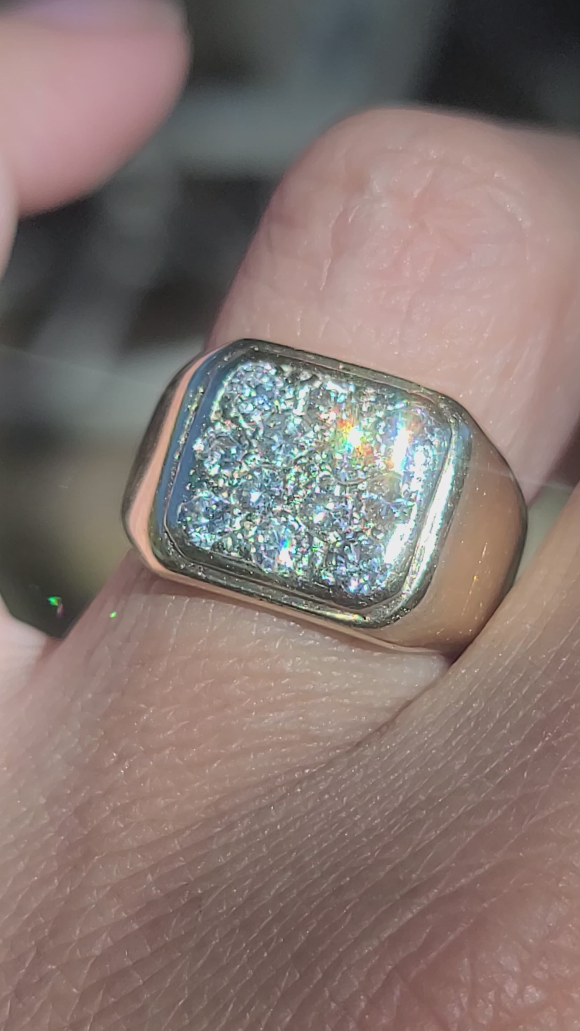 Gorgeous signet style ring with diamonds and 14K yellow gold. This vintage ring is solid 14K gold weighing 10 grams. The diamonds are incredible! They measure approximately 3.5mm each. There are a total of 12 diamonds, VS2 in clarity and colorless. These diamonds sparkle beautifully in outdoor and indoor lighting. This ring is unbelievably comfortable as it has a low profile and a smooth buttery gold surface.