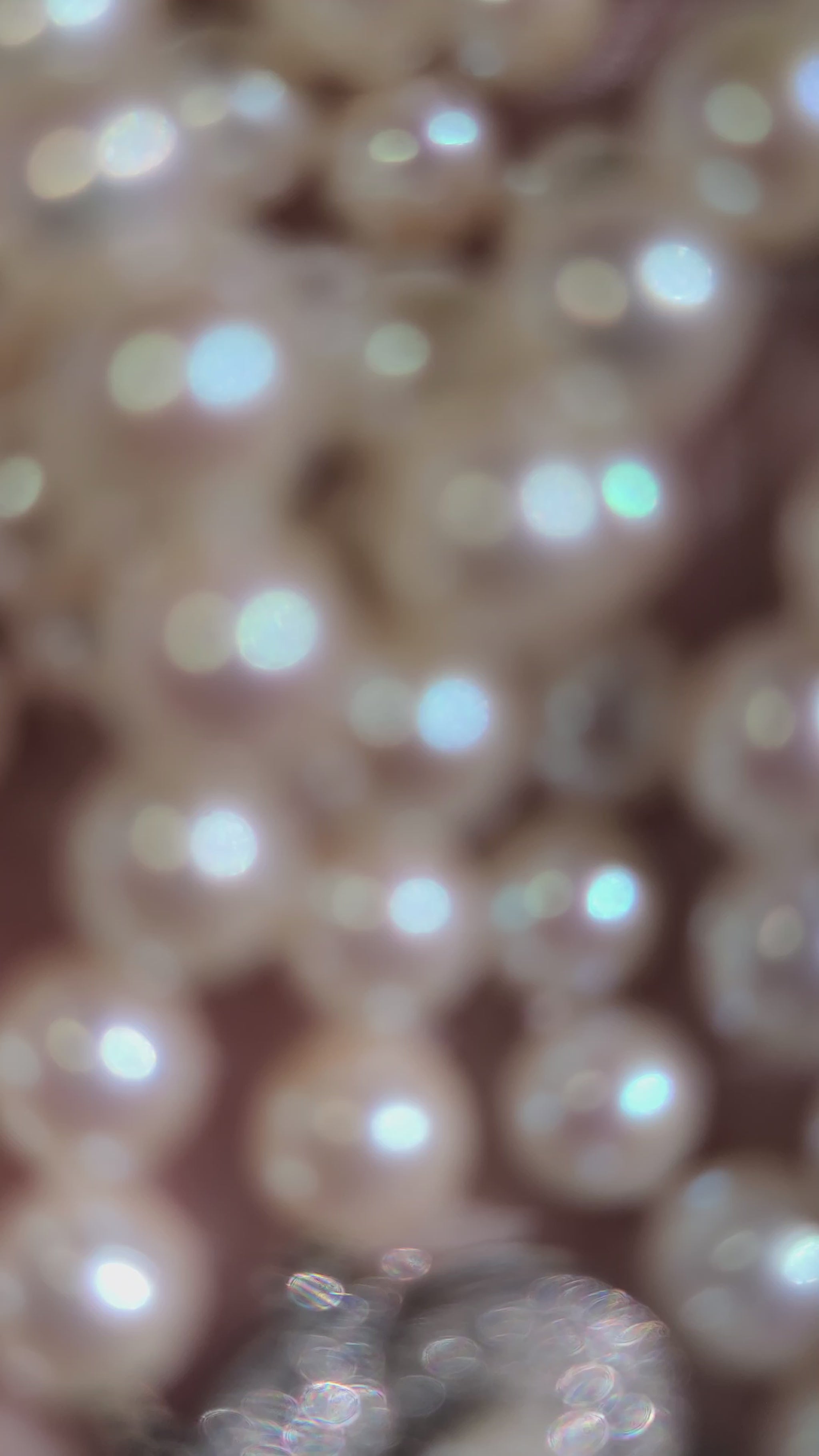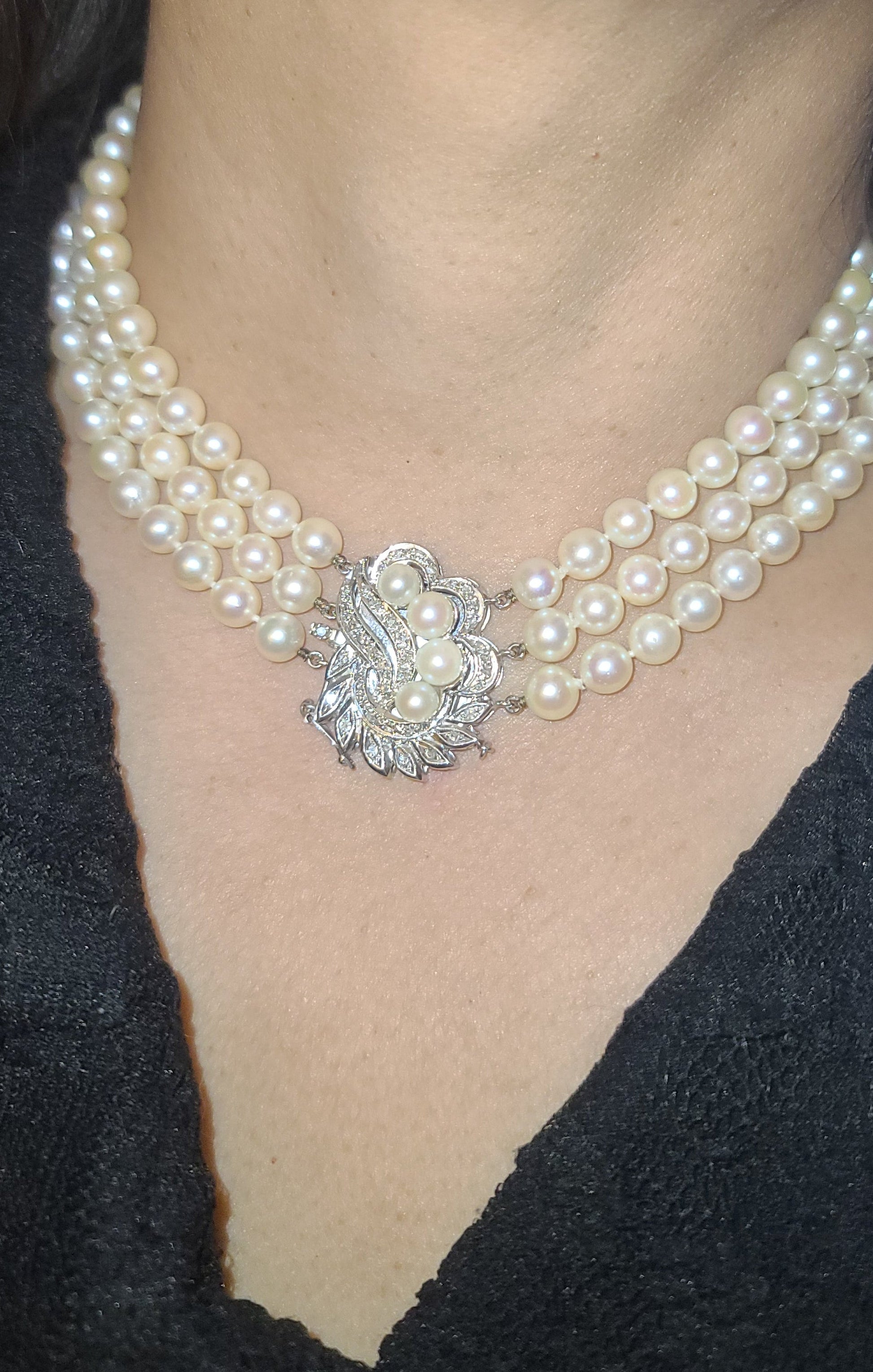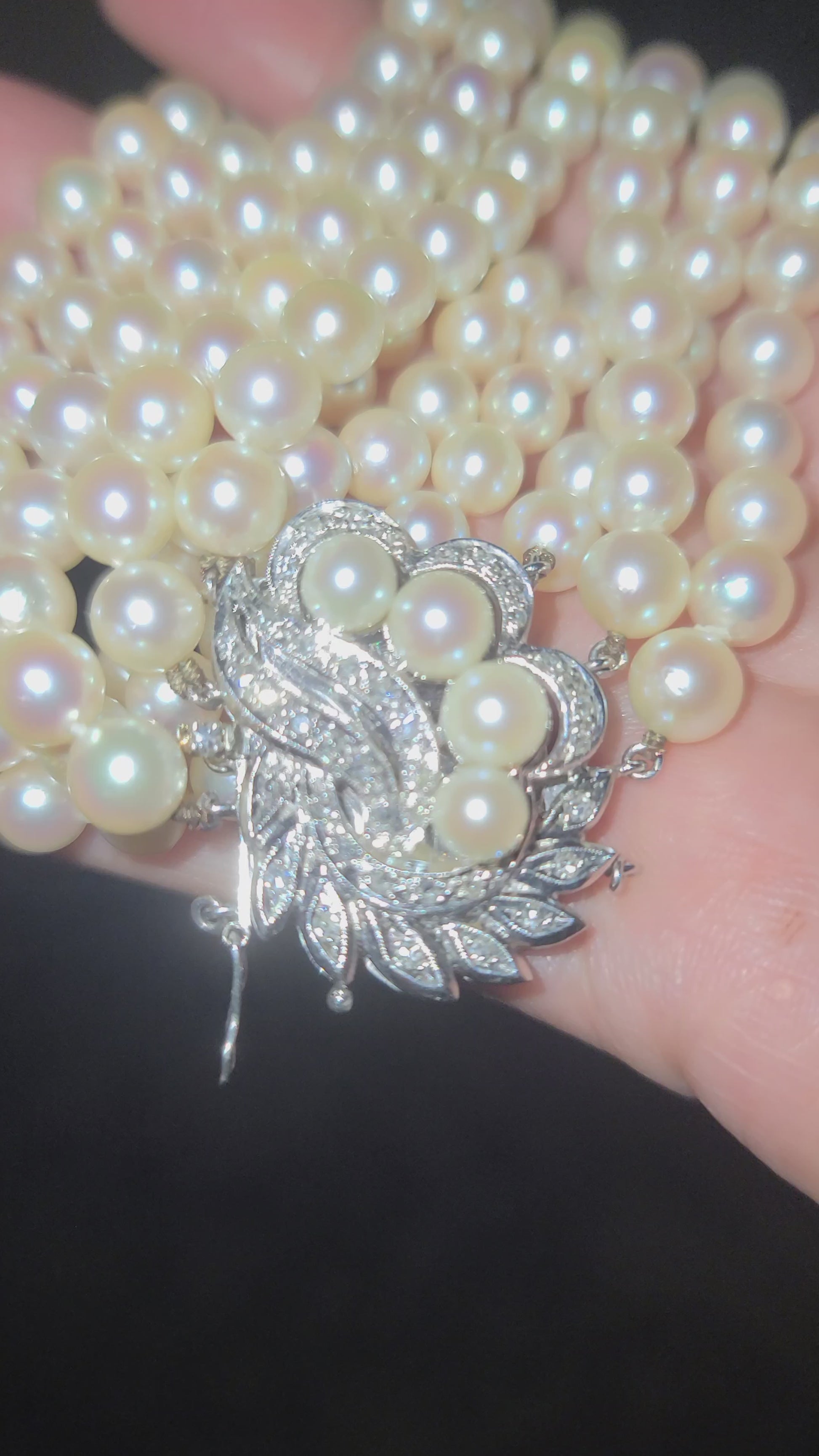 The necklace is composed of 3 strands of white pearls with a lovely pink blush. They are smooth with little to no visible blemishes and are of he highest quality. The pearls measure approximately 6mm. The clasp is 14K white gold and is encrusted with approximately 1 ct of clean and colorless diamonds. A graceful design with swirls and marquise shapes. There are also 4 more pearls on the clasp. The clasp is an insert clasp with a safety as well. This can be worn in the front as I have done, but would also look fabulous in the back if you wear your hair up.