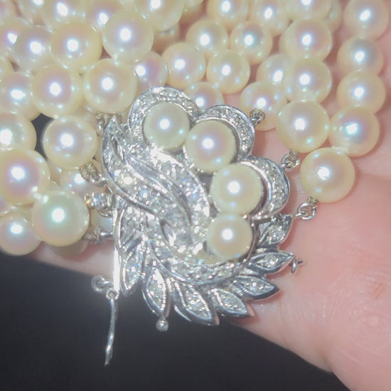 Vintage Estate 14K White Gold and Diamond Three Strand Pearl Necklace